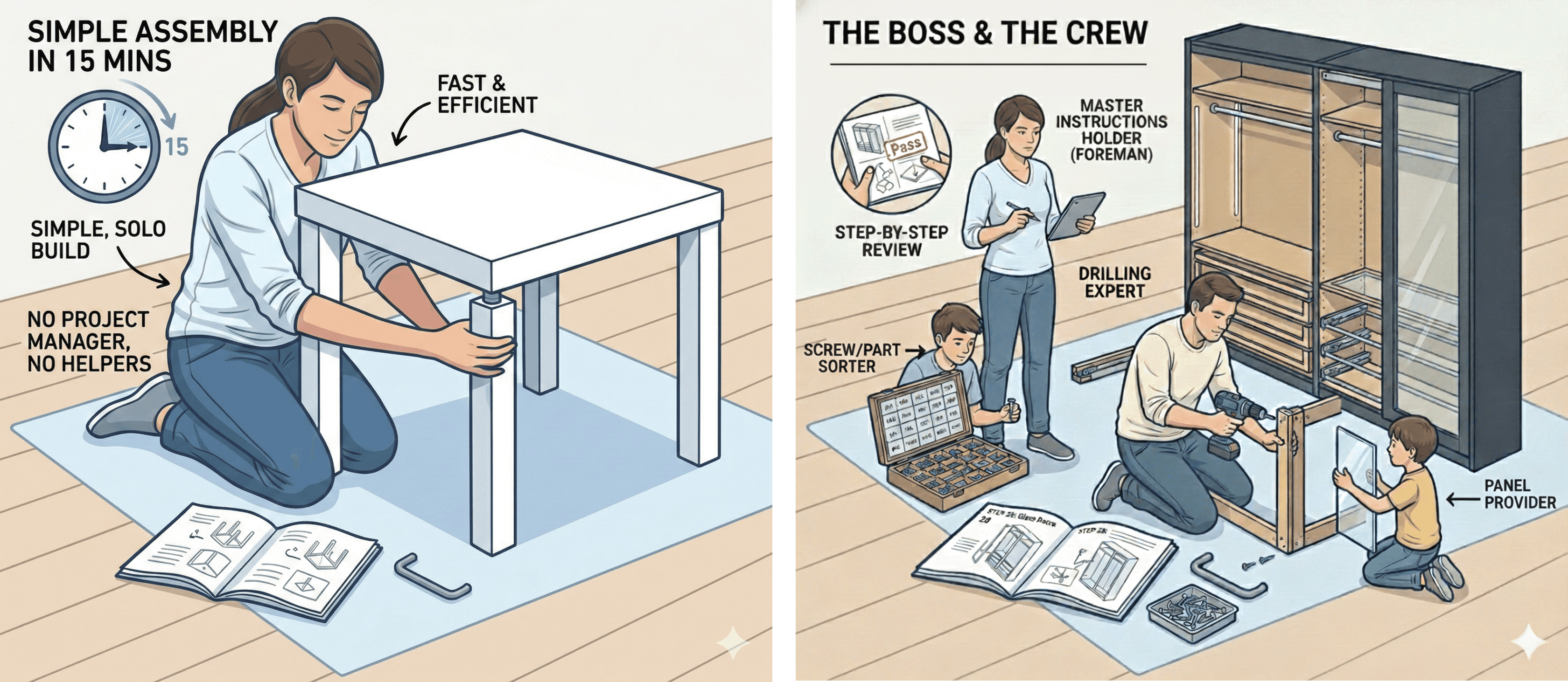 How it works: This is a coordinated crew. One foreman holds the master instructions and understands the final goal. Dad drills the frame, the drilling expert. The teenager sorts the hundreds of screws and provides them in time for the specific step. The youngest kid passes the right panels at the right time. The foreman reviews each major step before the crew moves to the next. Hopefully this family gets along well.